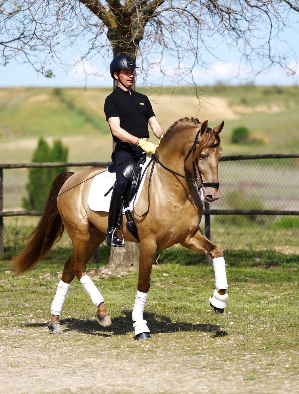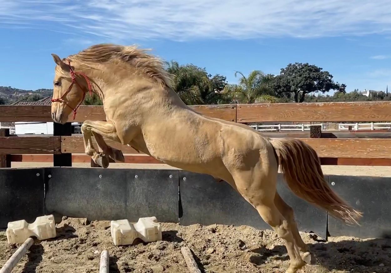 A double dose of pearl results in a fantastic metallic hue (ranging from bronze to platinum or brilliant gold), usually accompanied by an extreme shine. This is truly one of the most unique and sought after colors in the Iberian breeds. To combine this rare color with his overall quality and potential for dressage is a rare treasure.