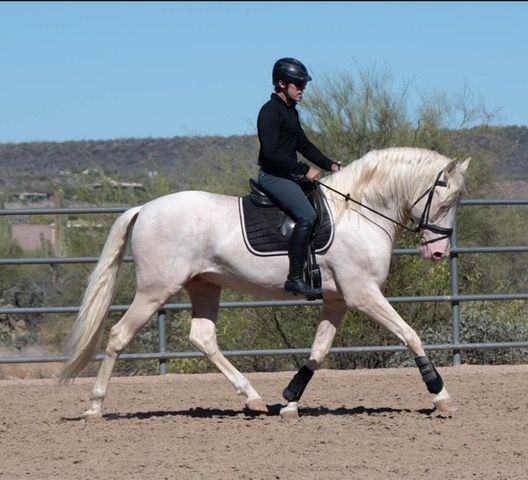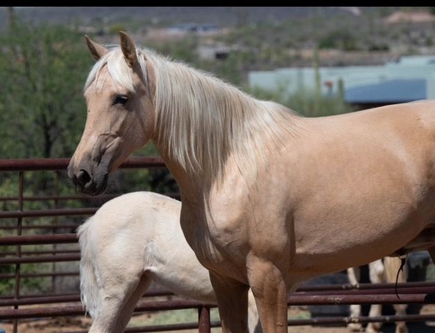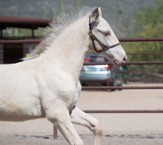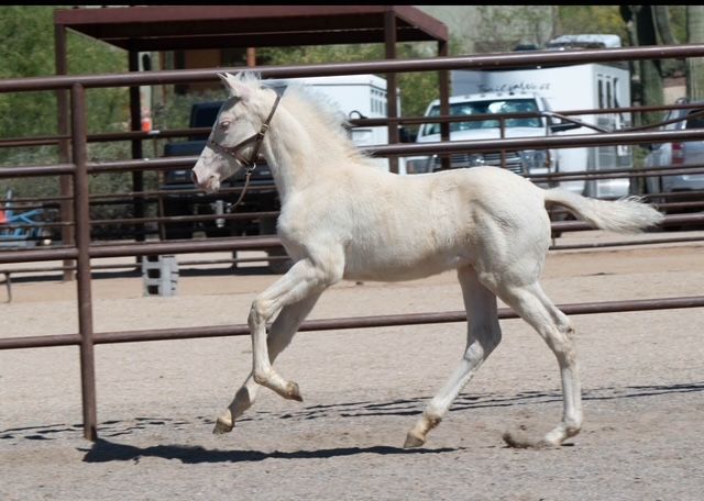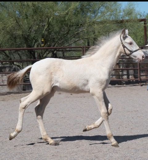 Curious and social, this lovely colt will be over 16 hands. The sire is Altivo Vinyet who is a 17 hand Cremello dressage champion. The dam is Plata PM who is my favorite mare due to her sweet nature and smooth gaits and straight movement under saddle. Located in AZ. Priced to sell quickly!